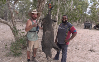 More km’s and more dry swamps we then came into a thicker swamp full of dried tries not as open as we like them. I managed to see some dust off in this distance and caught site of some cattle moving out of the thick stuff this usually means water which is a good start to finding some pigs. I made my way over to them and pulled up at the mud puddle they were lying in just on the other side of the mud puddle was two cracking boars standing there together one of them being far larger form the other. I checked on the GPS and the other boys were a long way off so I was on the radio trying to let them know what I had found. Now anyone that hunts with radios can understand when the tensions high and the radios aren’t working that it can be very frustrating. I was relaying to Craig to get the hell over here as I only had one dog and I didn’t want to miss this second boar. I was directing him in (or trying to anyway) while I watched him on the GPS. The whole time I was talking to him his radio was on the wrong channel and after watching these boars for 3-4 minutes I see him come up behind them and say on the radio “Where the hell are ya ive got 2 boars just standing here” yeah no sh#*t mate ive been watching them here for ages trying to get onto you. But from then it was game on the boars were off and I see him drop his dogs I let Maxy go and prayed he would grab his own. They headed into the thick stuff so I missed the hit up but I was stoked when I was fighting through the trees to pass Craig’s dogs with one big fella pulled up. I kept going and found big maxy on the biggest boar of the two and they were punching on. Now Max is a massive dog and he can make a big boar look small but seeing him swinging on this big fella I knew he had a new P.B, I quickly dispatched the boar and could not wait to weigh him up. We dragged the big boars out and took a few photos and had a few laughs, we strung the big fella up and he went 101.7kg live Maxy biggest boar one out to date. The other boar we didn’t string up as it was hard work in the heat but we estimated him to be between 90-95kg. Poofter boars of this size and we nailed both we were all stoked no better way to finish off a long hot day in the sun.