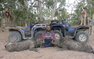We had two bikes and a polaris buggy for the day and were just hoping from swamp to swamp. The first swamp we pulled up at has a man made dam at one end and this holds water year round. We pulled up 150m from this dam in the ute an unloaded the bikes and buggy. It was about 10:00am but was already stinking hot and I took Max over for a drink at the dam, the other boys were still loading there rides. Couple of minutes later Craig starts making his way over to the dam and I see him waving his hands pointing to the right of where I was, he flys over and I see this big boar come out of know where and take off. This boar would have been 150 metres from the ute the whole time just watching us unload the bikes, buggy and hounds I couldn’t believe it. But anyway the big boar was off and Craigs Dog Xena wasn’t far behind him, she ended up pulling him up just at the tree line and they were boxing on, a good solid boar. Couldn’t have asked for a better start to the hunt.